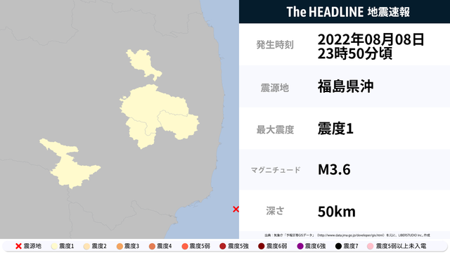 08月08日23時50分頃、福島県沖を震源とするマグニチュード3.6の地震が観測された。最大震度1を観測したのは、福島県。