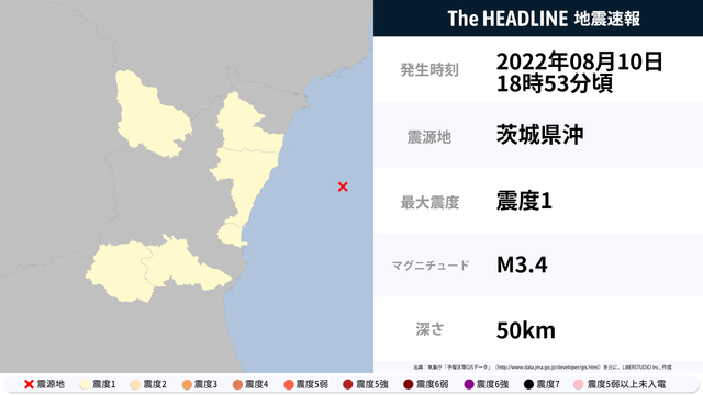 8月10日18時53分頃、茨城県で最大震度1の地震を観測