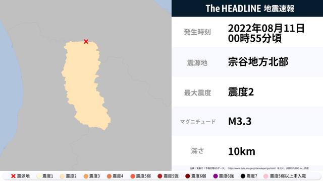 8月11日0時55分頃、北海道で最大震度2の地震を観測