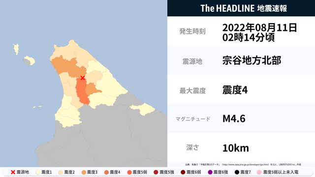 8月11日2時14分頃、北海道で最大震度4の地震を観測