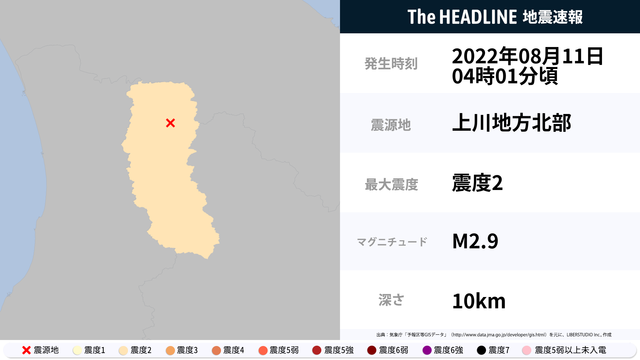 08月11日04時01分頃、上川地方北部を震源とするマグニチュード2.9の地震が観測された。最大震度2を観測したのは、北海道。