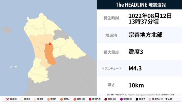 08月12日13時37分頃、宗谷地方北部を震源とするマグニチュード4.3の地震が観測された。最大震度3を観測したのは、北海道。
