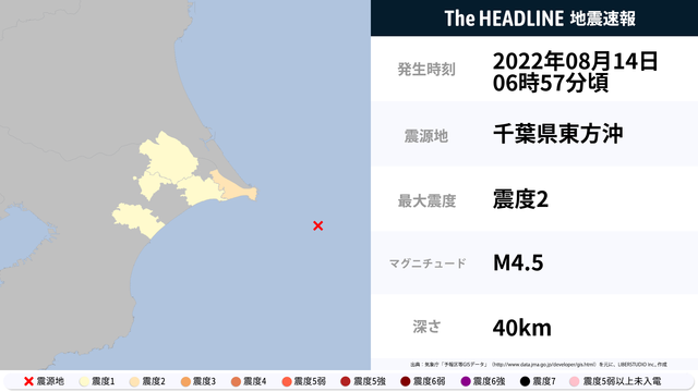 08月14日06時57分頃、千葉県東方沖を震源とするマグニチュード4.5の地震が観測された。最大震度2を観測したのは、千葉県。