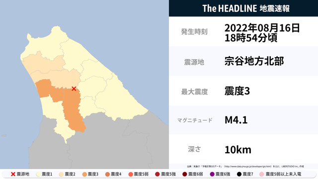 8月16日18時54分頃、北海道で最大震度3の地震を観測