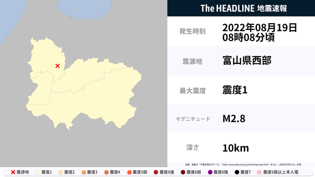 08月19日08時08分頃、富山県西部を震源とするマグニチュード2.8の地震が観測された。最大震度1を観測したのは、富山県・岐阜県。
