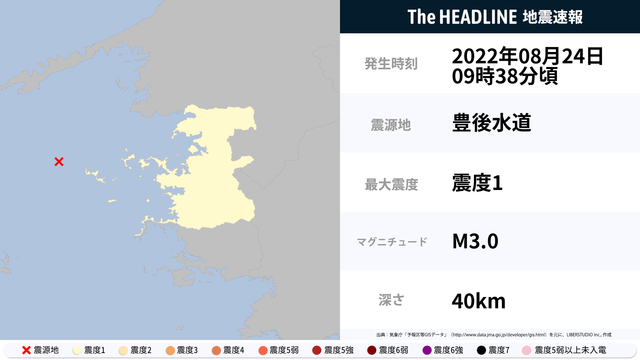 08月24日09時38分頃、豊後水道を震源とするマグニチュード3.0の地震が観測された。最大震度1を観測したのは、愛媛県。