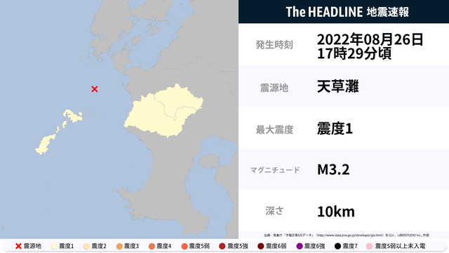 08月26日17時29分頃、天草灘を震源とするマグニチュード3.2の地震が観測された。最大震度1を観測したのは、鹿児島県。
