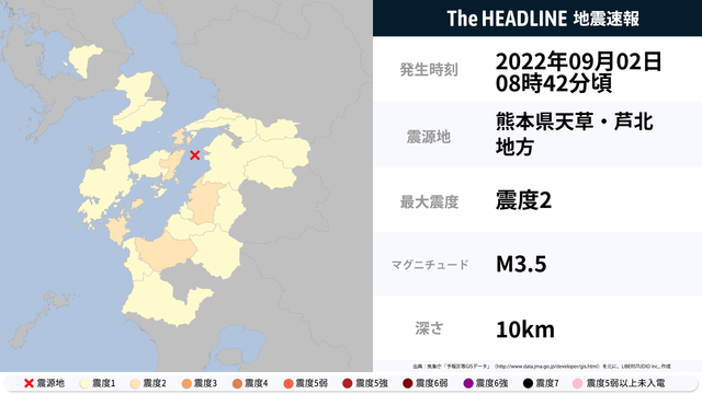 09月02日08時42分頃、熊本県天草・芦北地方を震源とするマグニチュード3.5の地震が観測された。最大震度2を観測したのは、熊本県・鹿児島県。