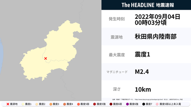 9月4日0時3分頃、秋田県で最大震度1の地震を観測