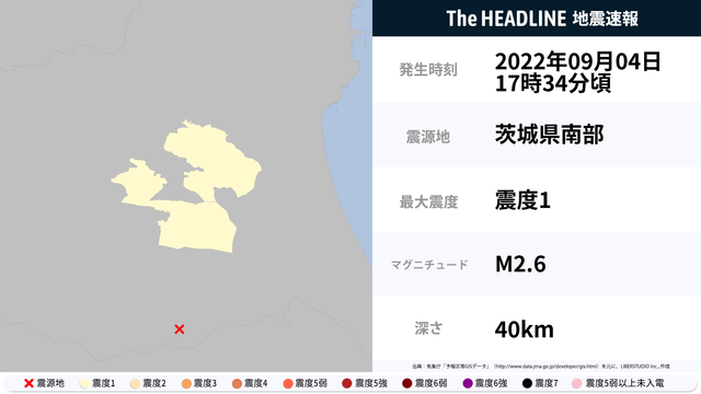 9月4日17時34分頃、茨城県で最大震度1の地震を観測
