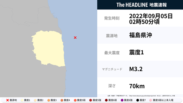 09月05日02時50分頃、福島県沖を震源とするマグニチュード3.2の地震が観測された。最大震度1を観測したのは、福島県。
