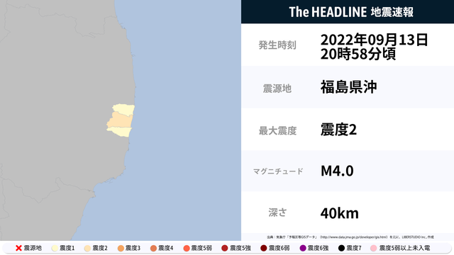 09月13日20時58分頃、福島県沖を震源とするマグニチュード4.0の地震が観測された。最大震度2を観測したのは、福島県。