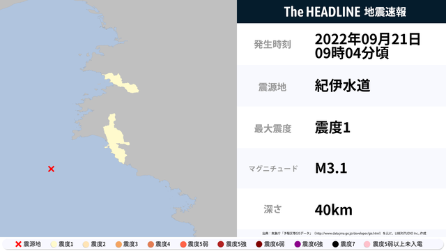 9月21日9時4分頃、和歌山県で最大震度1の地震を観測