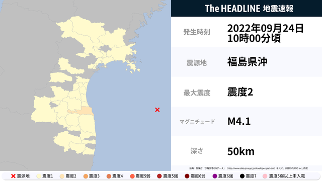 09月24日10時00分頃、福島県沖を震源とするマグニチュード4.1の地震が観測された。最大震度2を観測したのは、福島県。