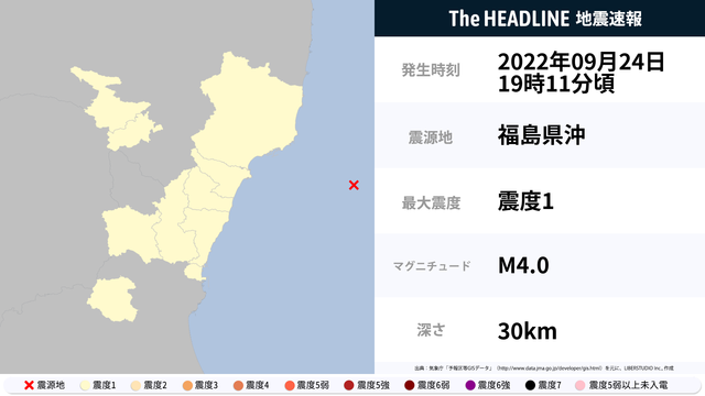 09月24日19時11分頃、福島県沖を震源とするマグニチュード4.0の地震が観測された。最大震度1を観測したのは、福島県・茨城県。