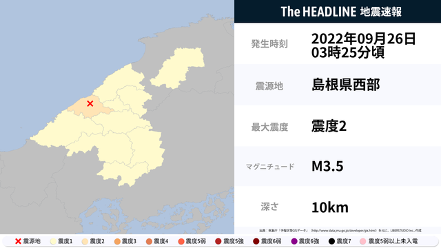 9月26日3時25分頃、島根県で最大震度2の地震を観測