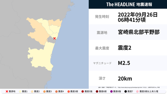 9月26日6時41分頃、宮崎県で最大震度2の地震を観測