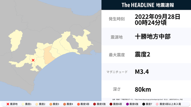 09月28日00時24分頃、十勝地方中部を震源とするマグニチュード3.4の地震が観測された。最大震度2を観測したのは、北海道。