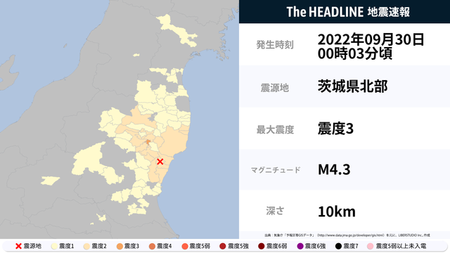 09月30日00時03分頃、茨城県北部を震源とするマグニチュード4.3の地震が観測された。最大震度3を観測したのは、福島県。