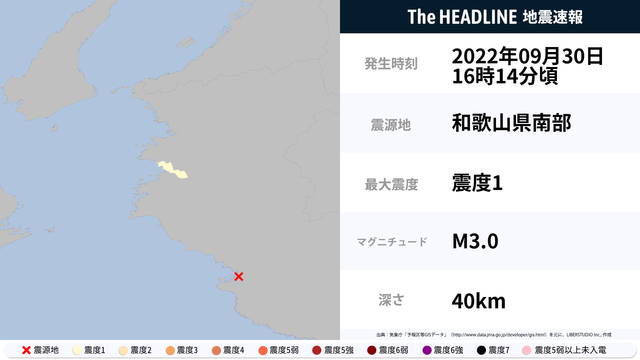 9月30日16時14分頃、和歌山県で最大震度1の地震を観測