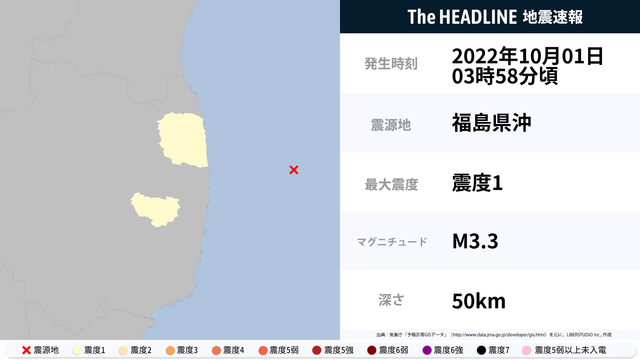 10月01日03時58分頃、福島県沖を震源とするマグニチュード3.3の地震が観測された。最大震度1を観測したのは、福島県。