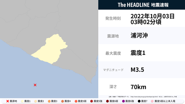 10月03日03時02分頃、浦河沖を震源とするマグニチュード3.5の地震が観測された。最大震度1を観測したのは、北海道。