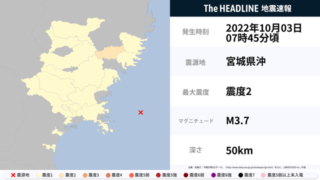 10月03日07時45分頃、宮城県沖を震源とするマグニチュード3.7の地震が観測された。最大震度2を観測したのは、岩手県。