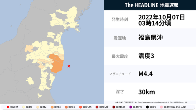 10月07日03時14分頃、福島県沖を震源とするマグニチュード4.4の地震が観測された。最大震度3を観測したのは、福島県。