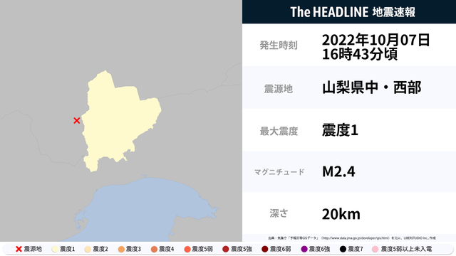 10月07日16時43分頃、山梨県中・西部を震源とするマグニチュード2.4の地震が観測された。最大震度1を観測したのは、静岡県。