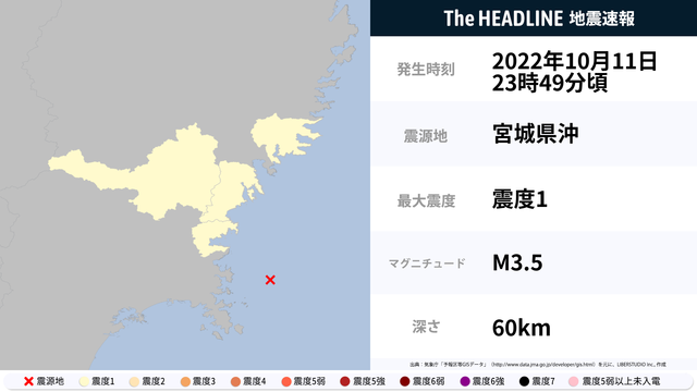10月11日23時49分頃、宮城県沖を震源とするマグニチュード3.5の地震が観測された。最大震度1を観測したのは、岩手県・宮城県。
