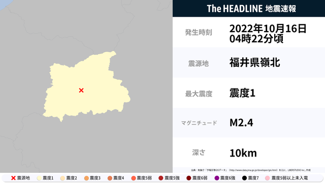 10月16日4時22分頃、福井県で最大震度1の地震を観測