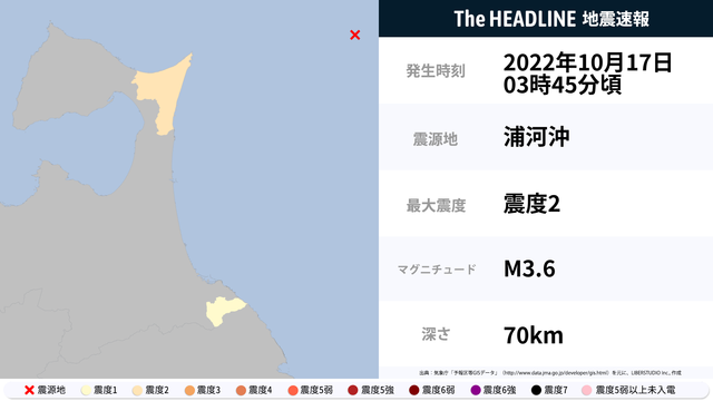 10月17日03時45分頃、浦河沖を震源とするマグニチュード3.6の地震が観測された。最大震度2を観測したのは、青森県。