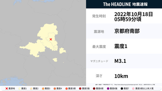 10月18日05時59分頃、京都府南部を震源とするマグニチュード3.1の地震が観測された。最大震度1を観測したのは、京都府。