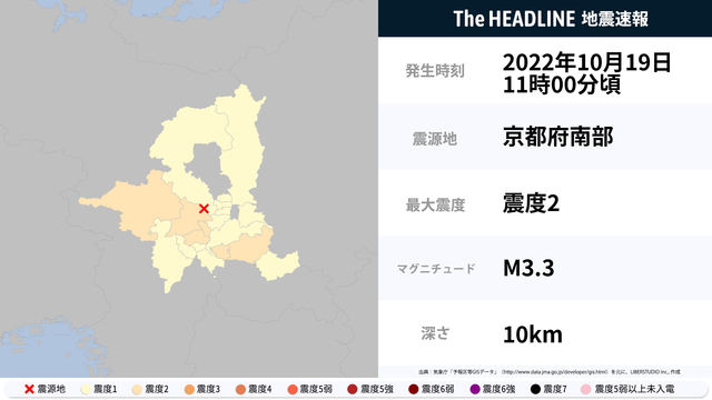 10月19日11時00分頃、京都府南部を震源とするマグニチュード3.3の地震が観測された。最大震度2を観測したのは、京都府。