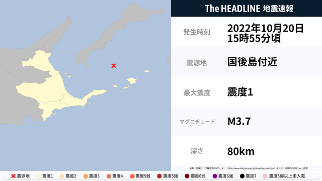 10月20日15時55分頃、国後島付近を震源とするマグニチュード3.7の地震が観測された。最大震度1を観測したのは、北海道。