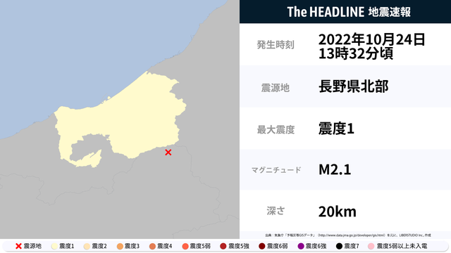 10月24日13時32分頃、長野県北部を震源とするマグニチュード2.1の地震が観測された。最大震度1を観測したのは、新潟県。