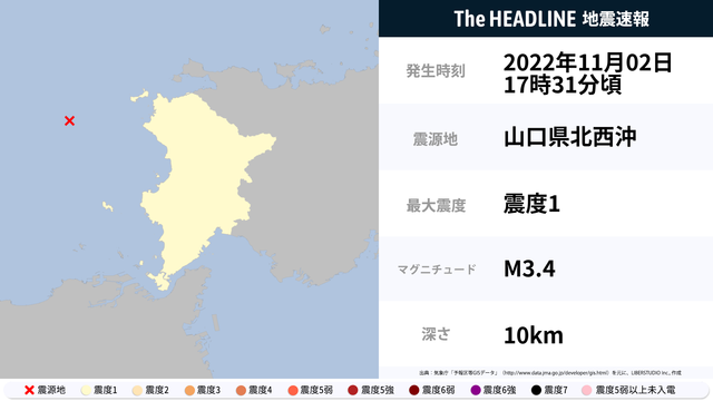 11月02日17時31分頃、山口県北西沖を震源とするマグニチュード3.4の地震が観測された。最大震度1を観測したのは、山口県。