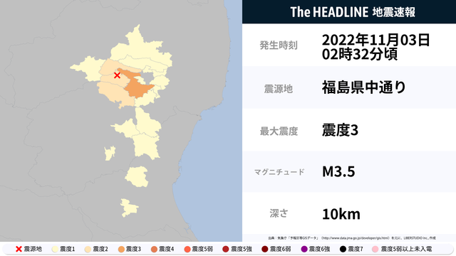11月3日2時32分頃、福島県で最大震度3の地震を観測