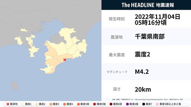 11月04日05時16分頃、千葉県南部を震源とするマグニチュード4.2の地震が観測された。最大震度2を観測したのは、千葉県。