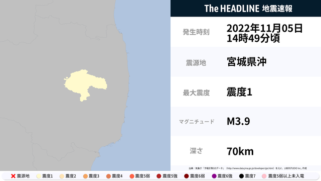 11月05日14時49分頃、宮城県沖を震源とするマグニチュード3.9の地震が観測された。最大震度1を観測したのは、福島県。