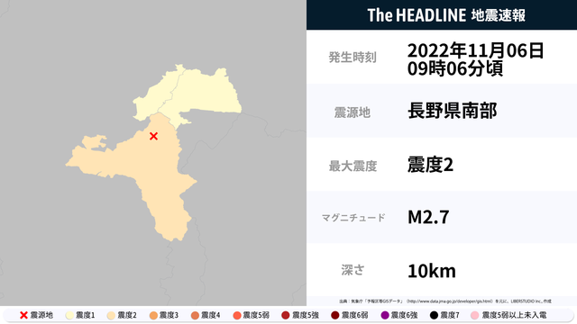 11月6日9時6分頃、長野県で最大震度2の地震を観測