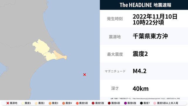 11月10日10時22分頃、千葉県東方沖を震源とするマグニチュード4.2の地震が観測された。最大震度2を観測したのは、千葉県。