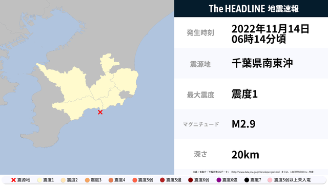 11月14日06時14分頃、千葉県南東沖を震源とするマグニチュード2.9の地震が観測された。最大震度1を観測したのは、千葉県。