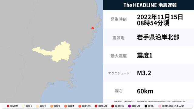 11月15日08時54分頃、岩手県沿岸北部を震源とするマグニチュード3.2の地震が観測された。最大震度1を観測したのは、岩手県。