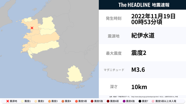 11月19日0時53分頃、和歌山県で最大震度2の地震を観測