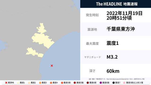 11月19日20時51分頃、千葉県東方沖を震源とするマグニチュード3.2の地震が観測された。最大震度1を観測したのは、千葉県。