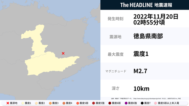 11月20日2時55分頃、徳島県で最大震度1の地震を観測