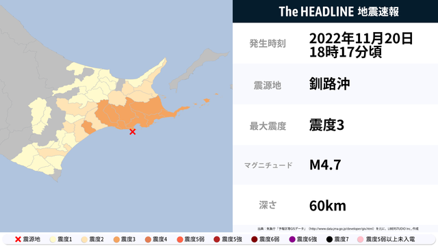 11月20日18時17分頃、釧路沖を震源とするマグニチュード4.7の地震が観測された。最大震度3を観測したのは、北海道。