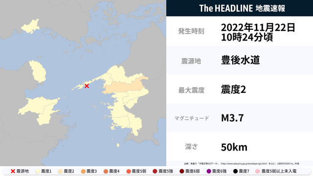 11月22日10時24分頃、豊後水道を震源とするマグニチュード3.7の地震が観測された。最大震度2を観測したのは、愛媛県。