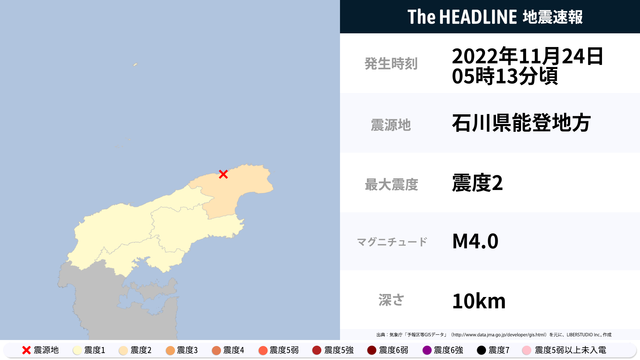 11月24日5時13分頃、石川県で最大震度2の地震を観測